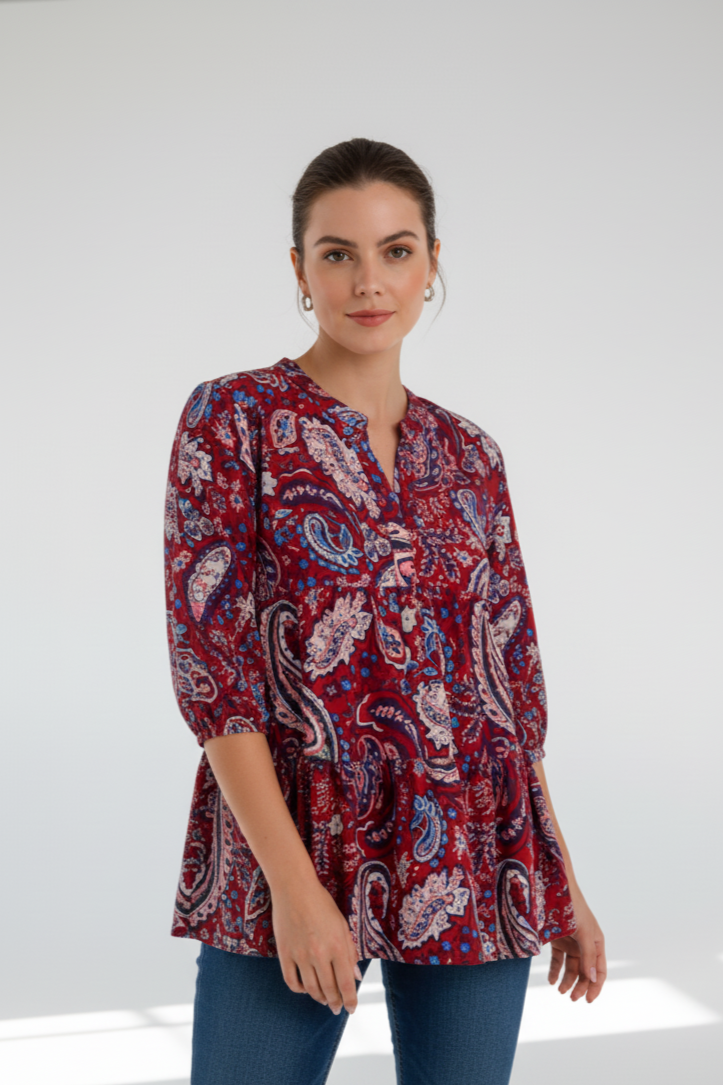 The Mix Paisley Boho Tunic Blouse is a stylish and versatile piece that can be dressed up or down for any occasion. Featuring a beautiful paisley print and a flowy tunic silhouette, this blouse is perfect for adding a bohemian touch to your wardrobe. The lightweight fabric makes it comfortable to wear all day long, while the loose fit provides a flattering and effortless look. Pair it with jeans for a casual day out, or dress it up with heels and statement jewelry for a night out. With its unique design and vibrant colors, this blouse is sure to be a favorite in your collection.